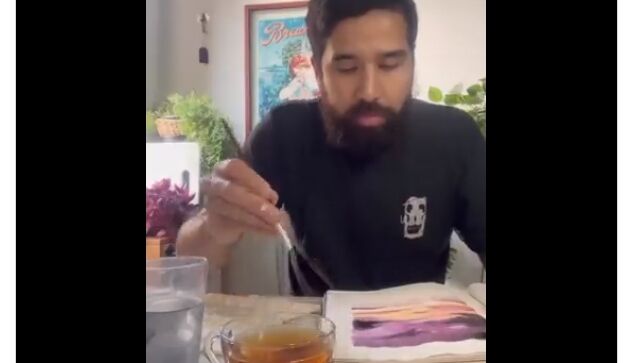 奥さんが初めて焼いてくれたというブラウニーを手に、ビデオ撮影しながら食べる夫。