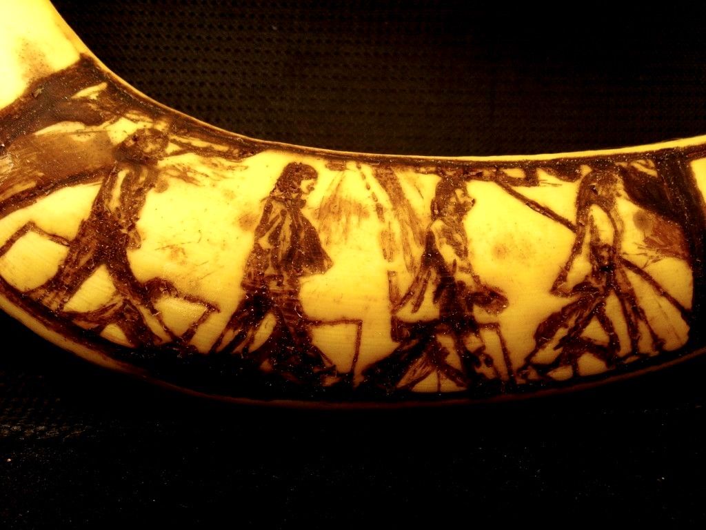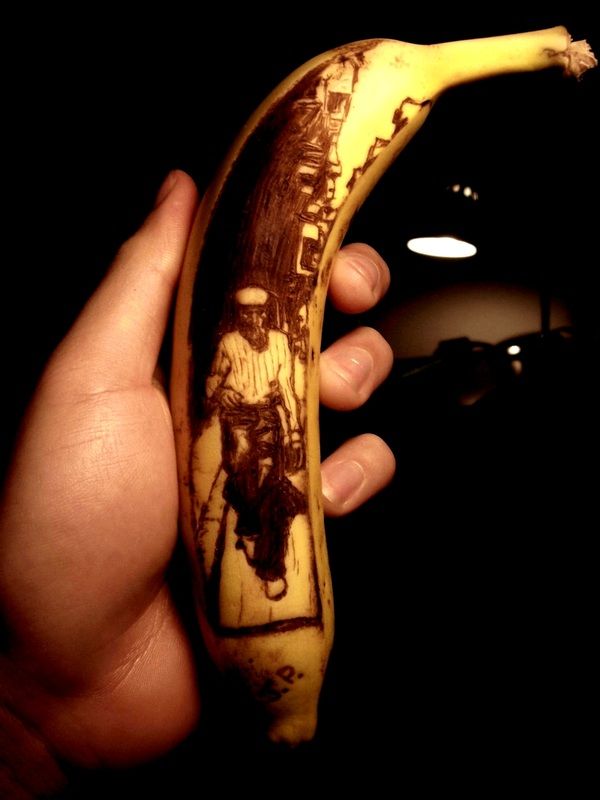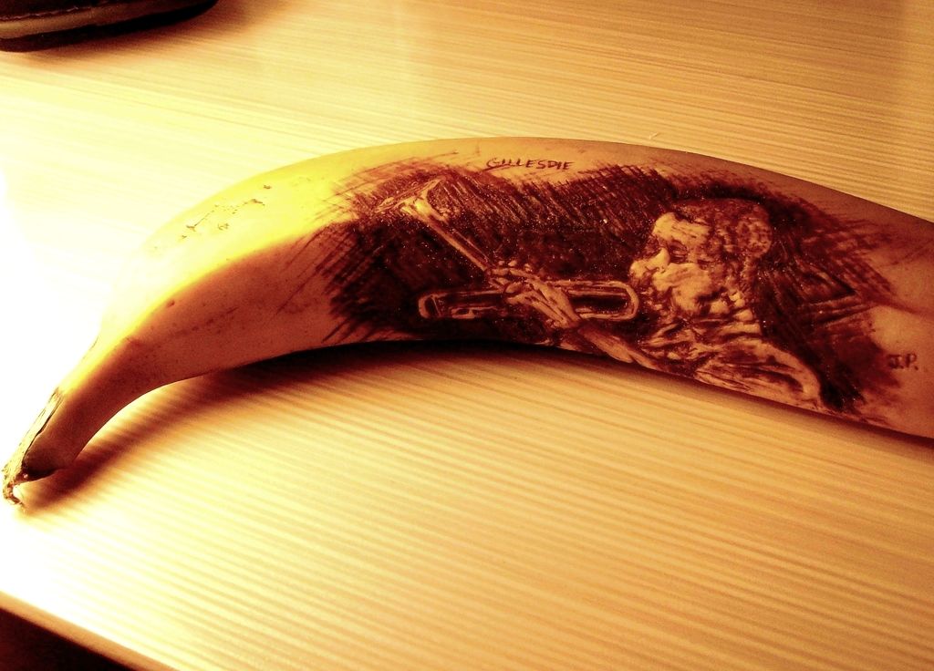とっても身近で手軽な素材、バナナをキャンバス代わりに使ってイラストを描く、オーストラリア、メルボルン在住のアーティスト、ジュン・ギル・パークによるバナナアート作品。あんまり細かい濃淡は描けないみたいだけど、傷ついた部分が黒くなるバナナの特徴を生かして描くというのは、なるほど面白い手法。