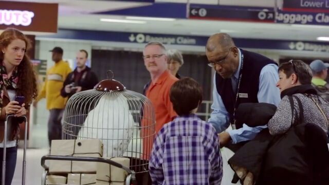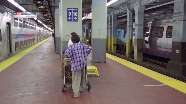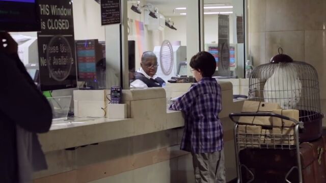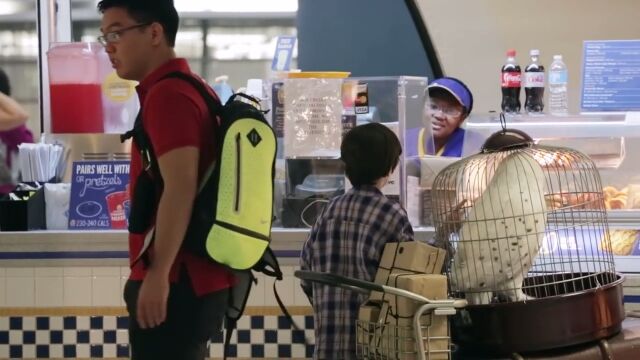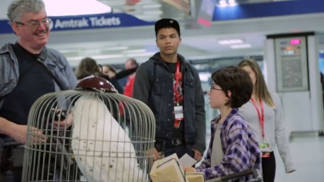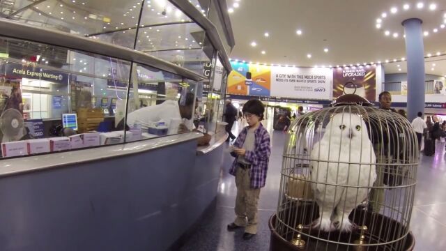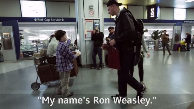 大きな荷物と白いフクロウが入った鳥かごをカートに載せ、丸眼鏡をかけた少年。駅の中で訪ね歩くのは、「9と3/4番線はどこですか?」「ホグワーツに向かいたいんですけど」という内容。
