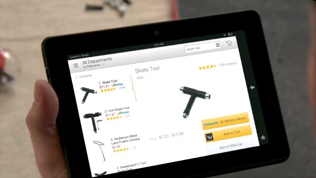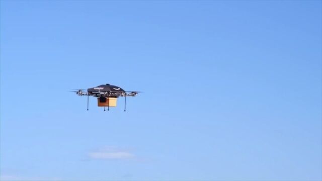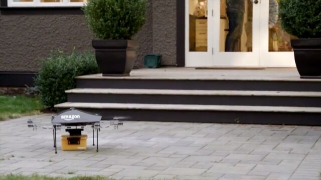 Amazon Prime Airで商品を購入すると、自動操縦の小型マルチコプターが商品を抱えて最寄りの倉庫から発進。注文者の住所まで直接、まっすぐに飛んできてくれるという仕組み。