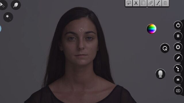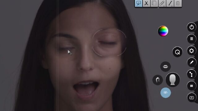 お肌の染みやホクロを消し、目の下のクマを消し、右目を反転コピーして左目に。