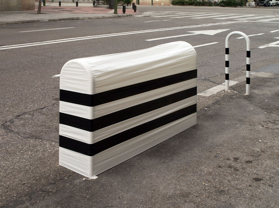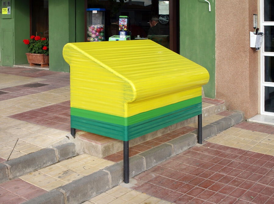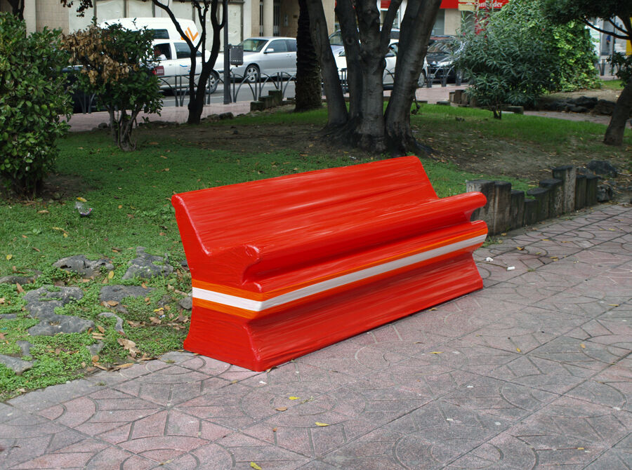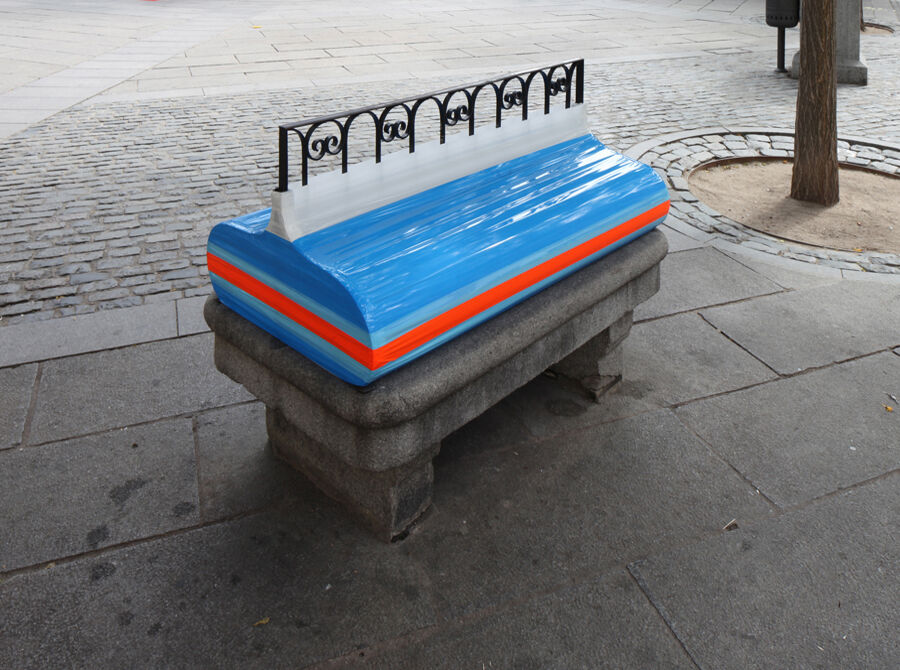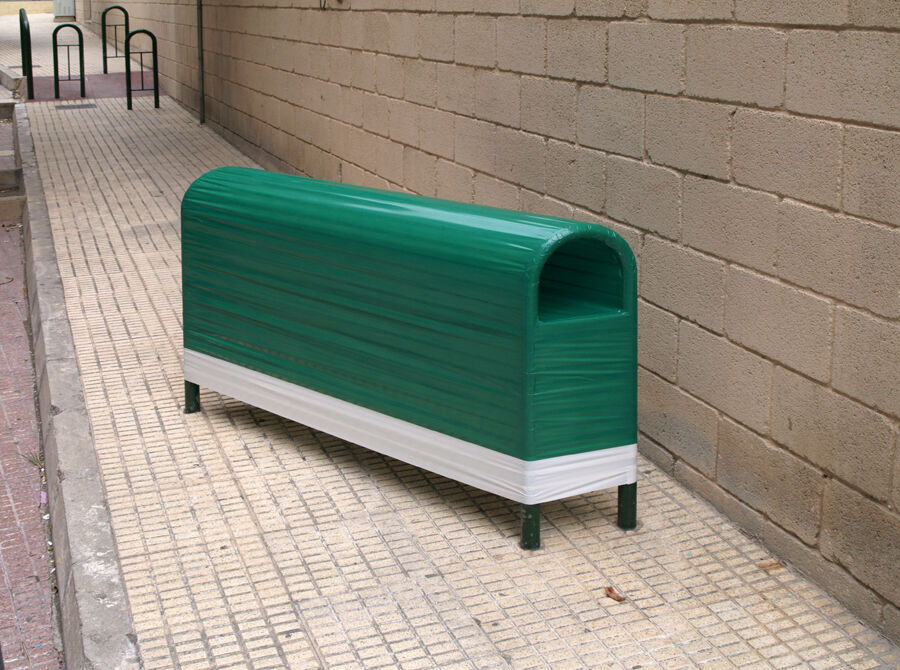 ベンチや手すり、街灯などが包み込まれ、元とは全く印象の異なる物体に変化しつつ、正しく使用できなくてはた迷惑な感じに。