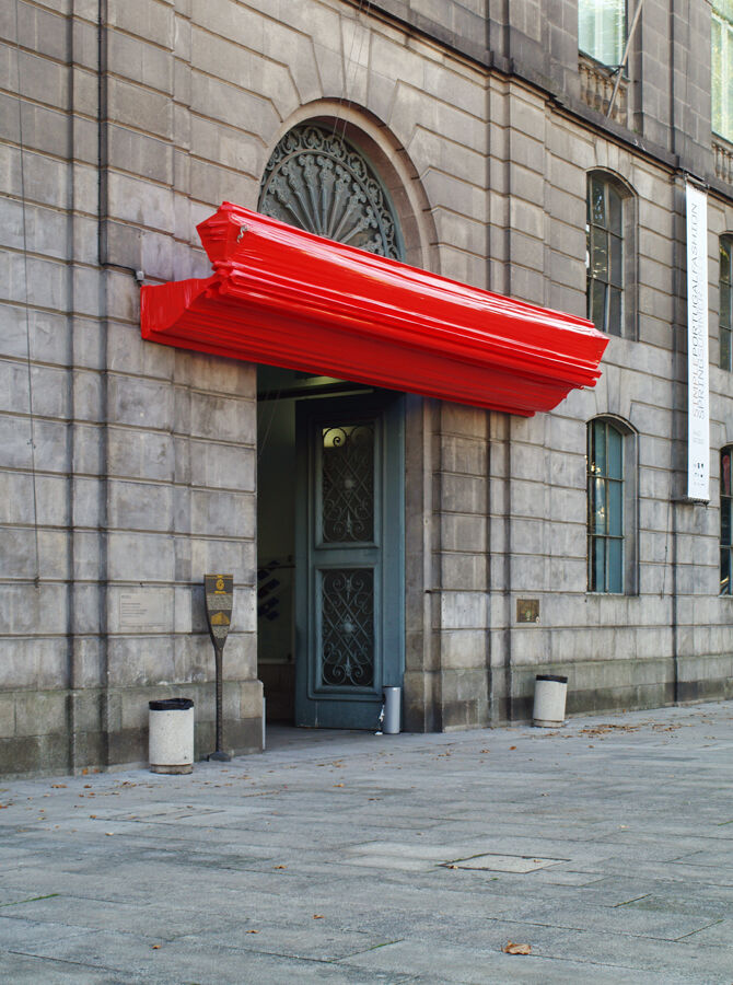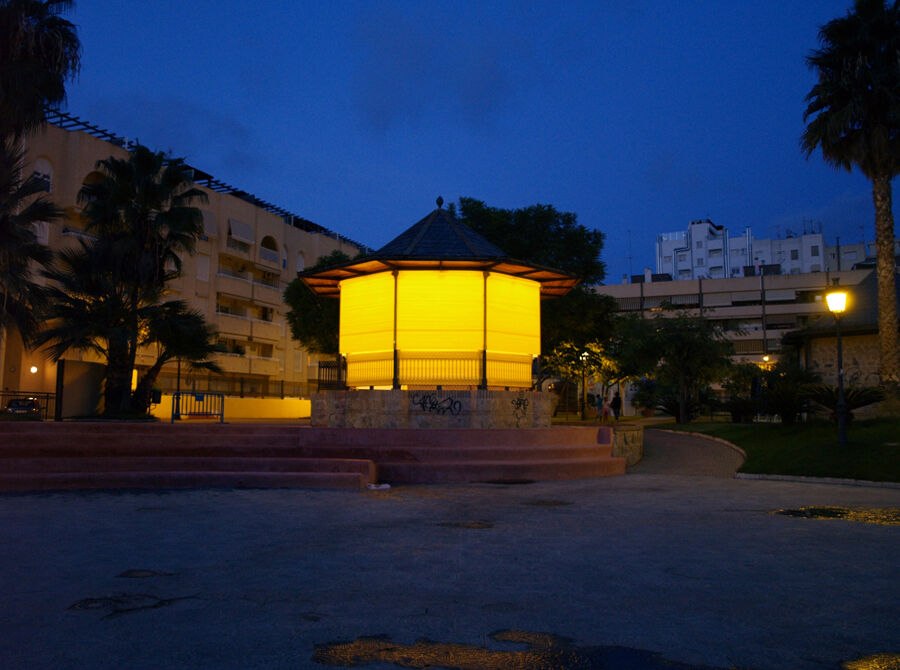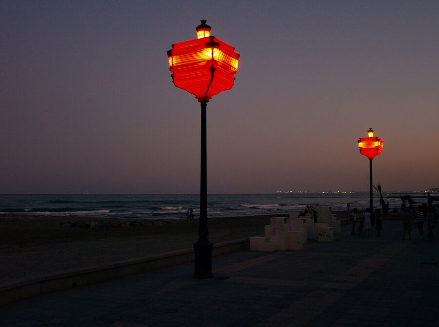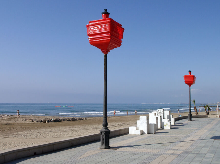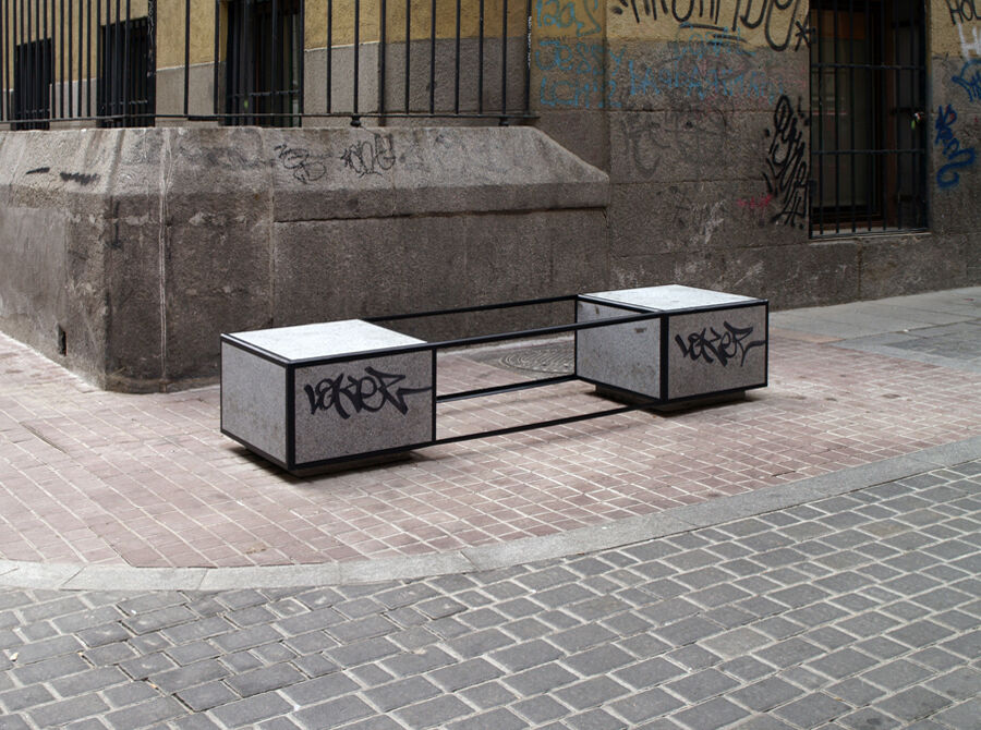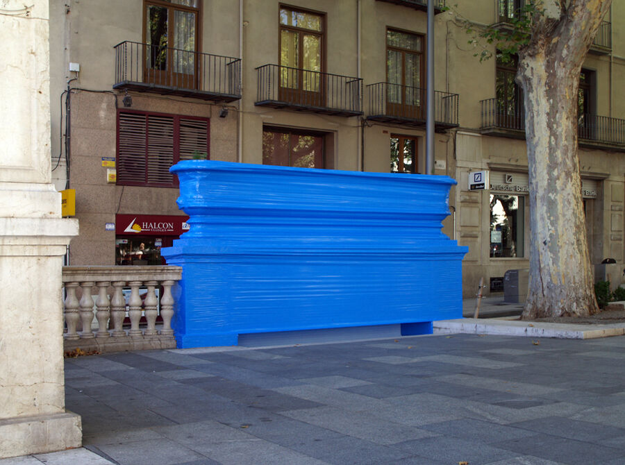 ベンチや手すり、街灯などが包み込まれ、元とは全く印象の異なる物体に変化しつつ、正しく使用できなくてはた迷惑な感じに。