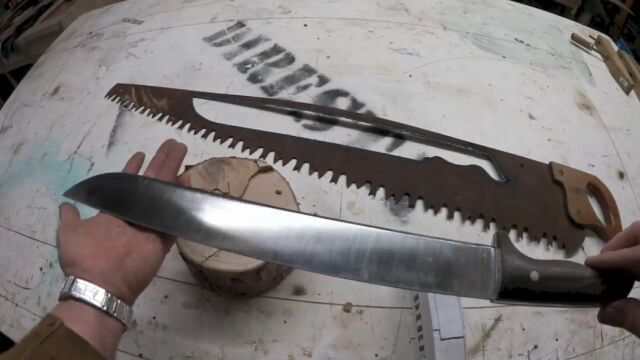 刃全体が錆びついて、再び使う予定もない大きなノコギリを、マチェーテとして再利用するJimmy DiRestaによる職人技。