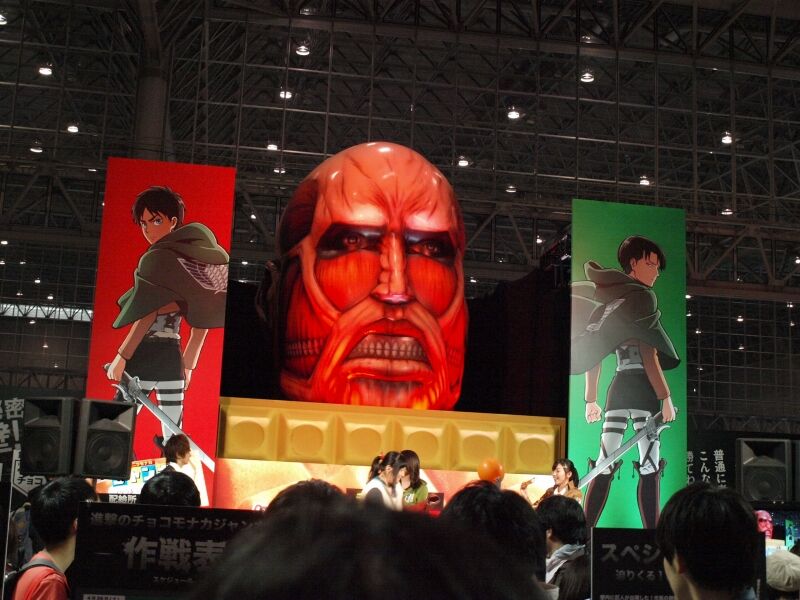 進撃の巨人とコラボしたチョコモナカジャンボのブース。「チョコモナカ?」と問われて「ジャンボ!」と答えるとチョコモナカジャンボが貰えるイベント中。