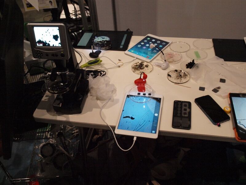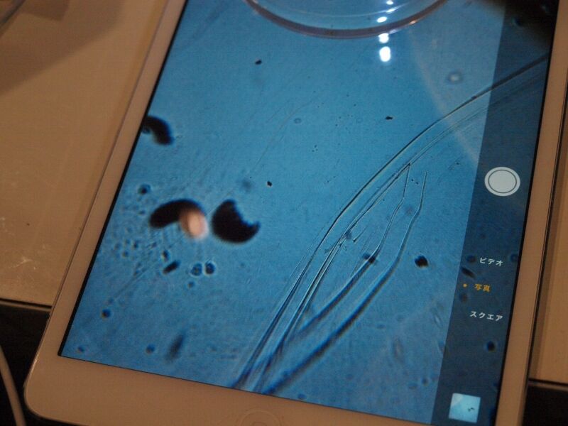 スマホのフロントカメラに載せて倍率を100倍にできるレンズを使って、シャーレの中からクマムシ探し。