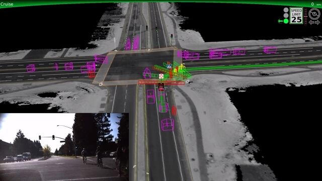 周辺の地形や車、歩行者、自転車などの位置や動きを認識し、次の動きを予測し、危険がないように最適な運転を自動的に選択。