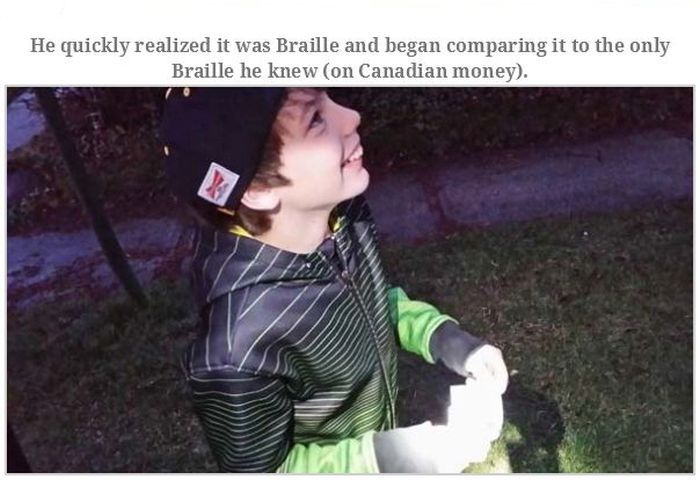 すぐに点字だと気づいたブロディーくん。知っている点字(カナダドル紙幣に表記された点字)と照らしあわせてみる。
