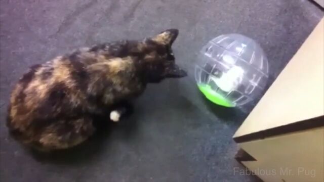 猫さんが獲物として見ていて、かつハムスターも逃げ回っていたら、虐待かもしれないけど、どのビデオもそうとは限らないみたいだね。