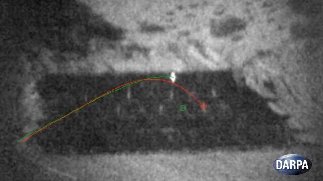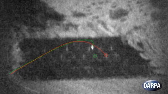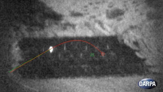 動画の後半は緑の丸が目標点で、赤い丸が照準を合わせた点。同じように、通常のライフル弾は赤いラインの通りに飛ぶはずだけど、EXACTOは軌道を変えて緑の丸を目指す。
