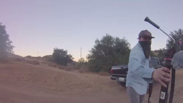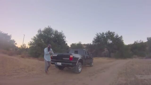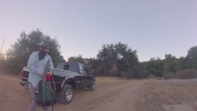 写真撮影を終えてキャンプ地へと徒歩で移動している途中、車に乗ってやってきた強盗にカメラが入ったバッグと三脚を奪われてしまった映像。