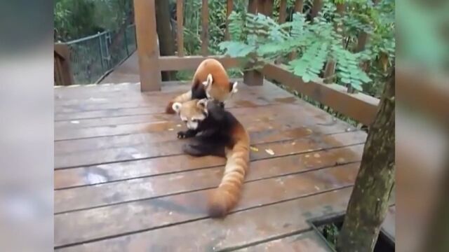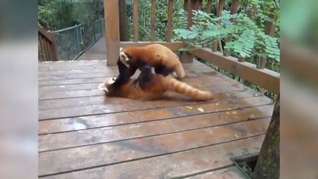 階段の踊場らしい場所で組んず解れつ取っ組み合いをする、2匹のレッサーパンダが可愛い映像。