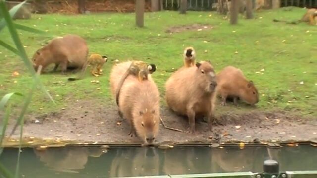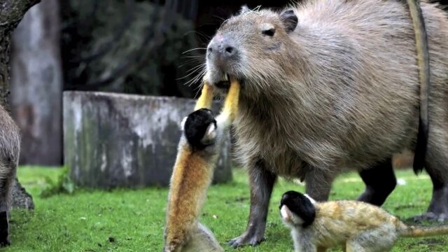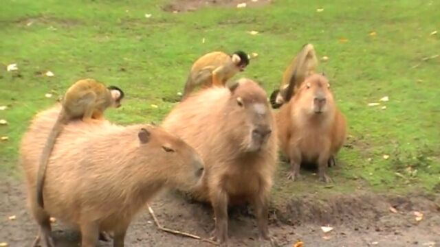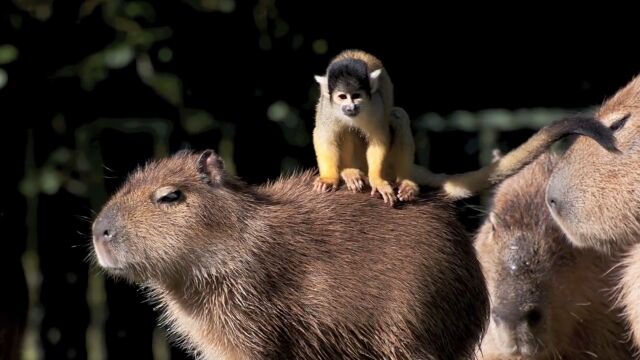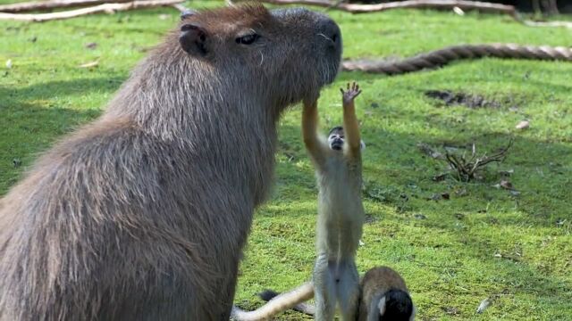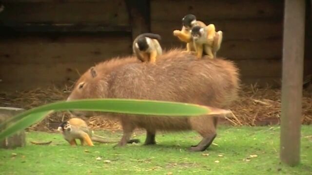 リスザルがカピバラに乗っている様子は可愛くて面白いけど、終始リスザルが一方的にカピバラに構っている感じだよね。
