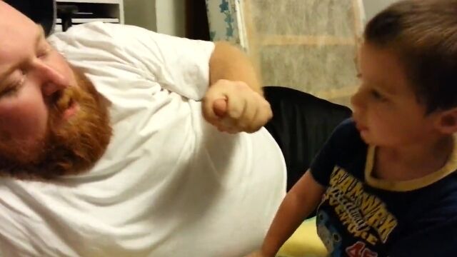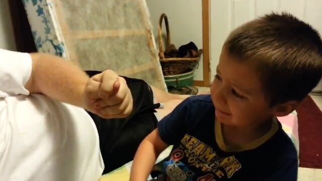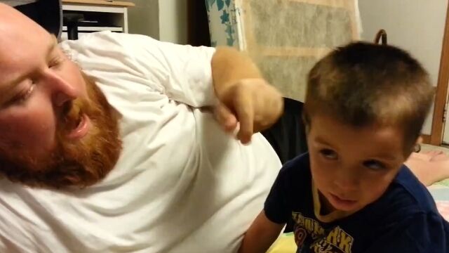 パパが男の子の耳をつまみ、引っ張ると同時に口で「ポンッ!」という音を立てて、耳を引き千切ったフリ。