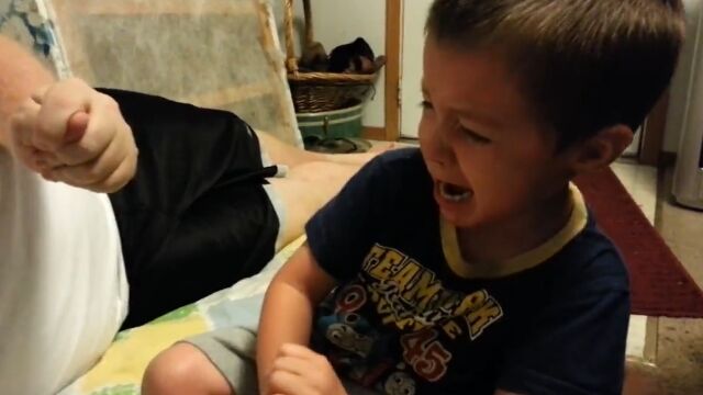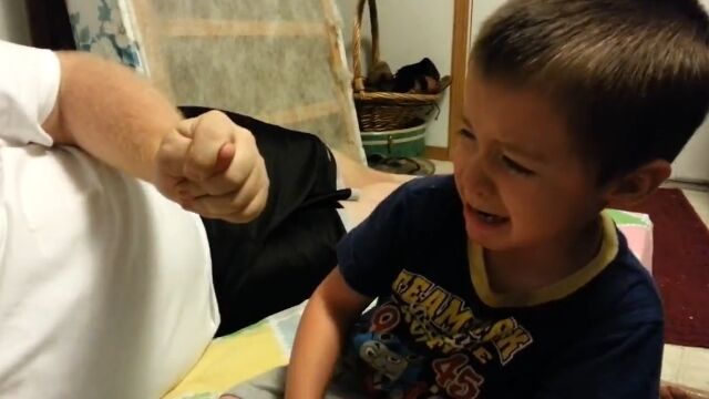 パパの指の間から覗く親指を見て、「パパに耳を取られた!」と思い込んでしまった男の子は、絶望のあまり泣いてしまうのだった。