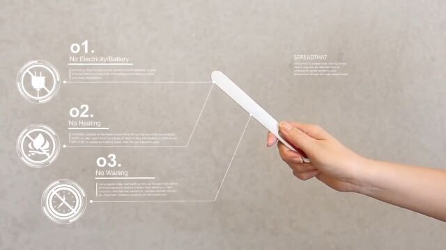 普通のバターナイフだと、冷たく固まったバターは塗りづらい。電池で発熱させるタイプのバターナイフもあるけど、この「SpreadTHAT!」は電池を使わず、人間の体温を刃に伝導させて、バターを溶かすという仕組み。