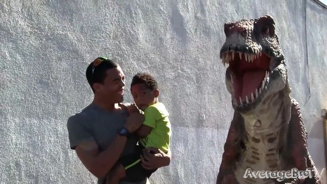 巨大な恐竜を前に立ちすくむ、2歳半のザックくん