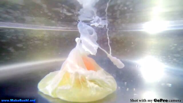 かき混ぜ棒でゆっくり混ぜて、ポーチドエッグが出来ていく様子を撮影した不思議な映像。