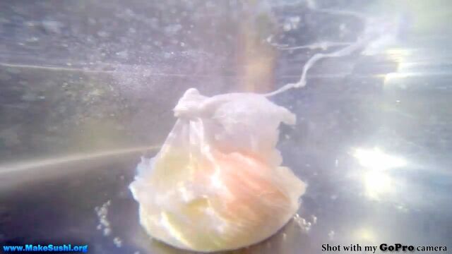 お鍋の中に水と少々の塩とお酢、さらにGoProカメラを入れて火をかけ、沸騰する手前で卵を投入。
