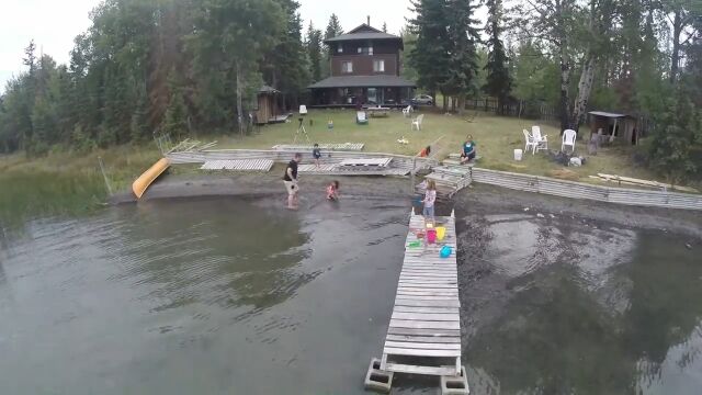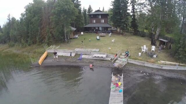 湖畔で水遊びを楽しむ家族の様子を、マルチコプターの「DJI Phantom 2」で撮影していたお父さん。