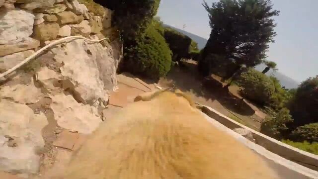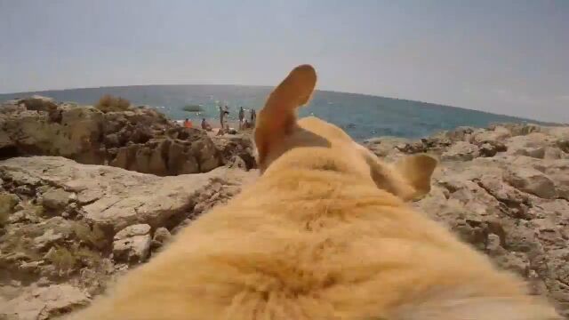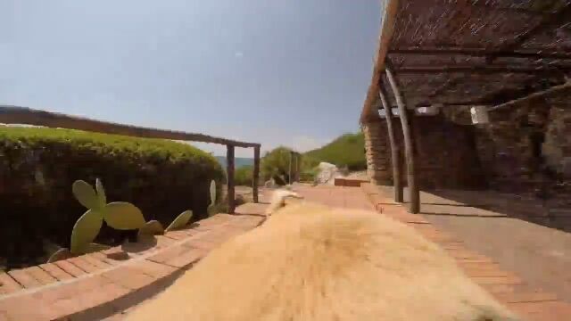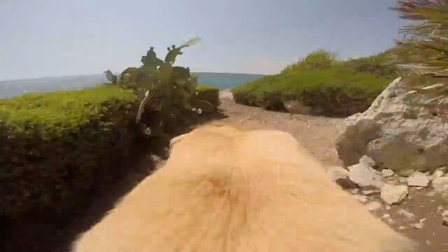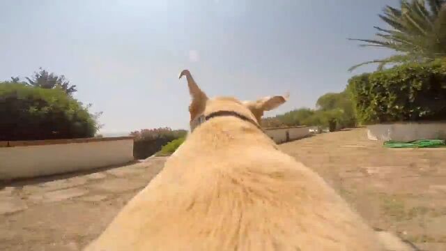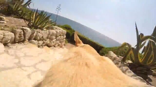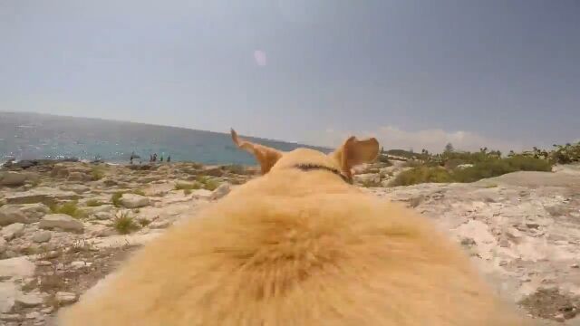 海辺の近くの小高い家から、合図とともに全速力で海へと駆けていく犬、ウォルターの背中から撮影した映像。