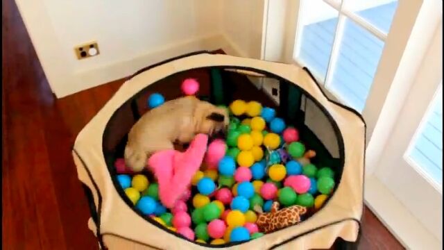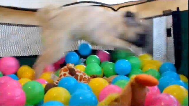 ボールプールが楽しくてたまらず、走りまくりのパグ犬、グローヴァーくん。