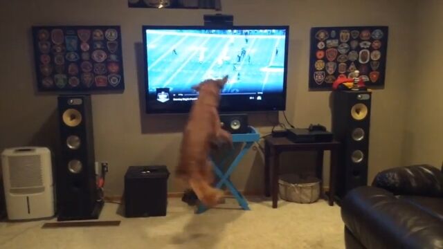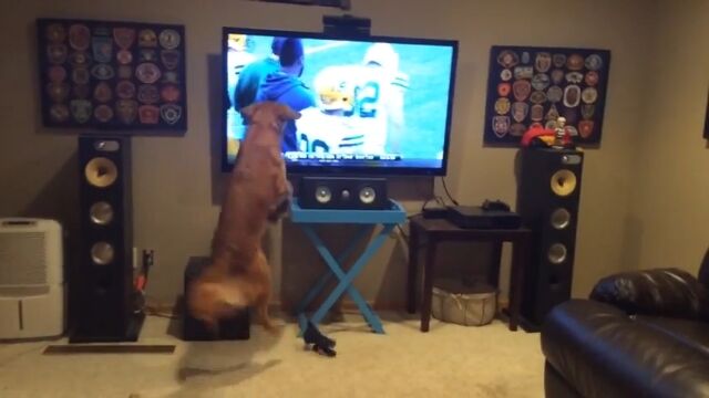 アメフト大好き!テレビがNFL中継に変わった途端に、飛び跳ねて大喜びする犬のジョージくん