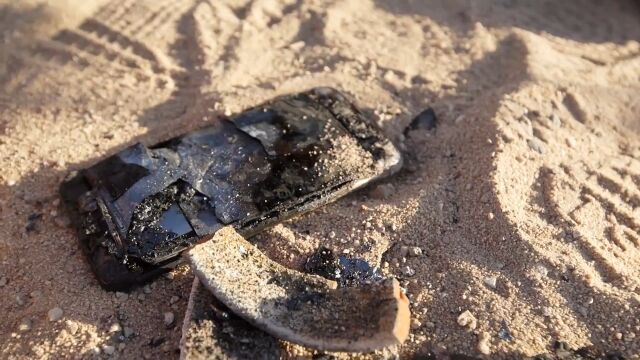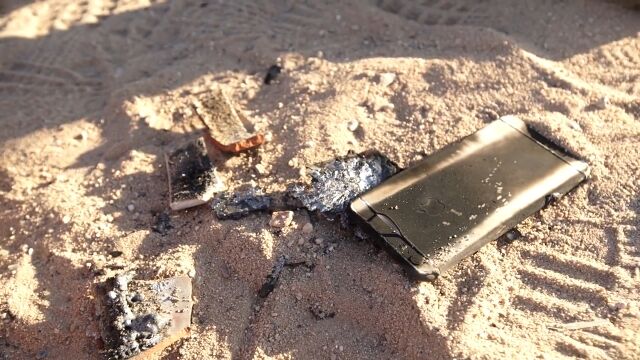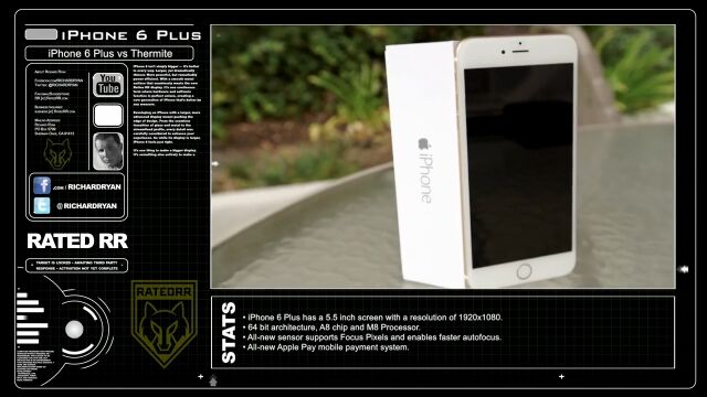 高温の金属融塊が容器を溶かし、下部に置かれたiPhone 6 Plusへと降り注いでいく。
