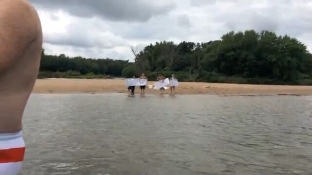 友人たちとボート遊びを楽しんでいたところ、ビーチの上で別の友人たちがなにやら紙を掲げている。