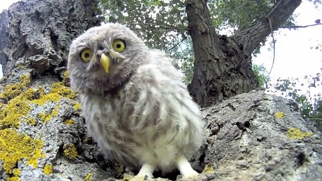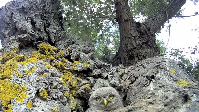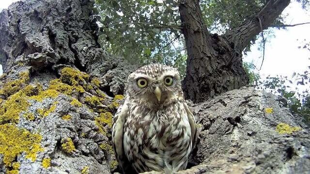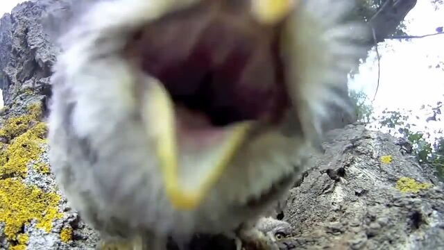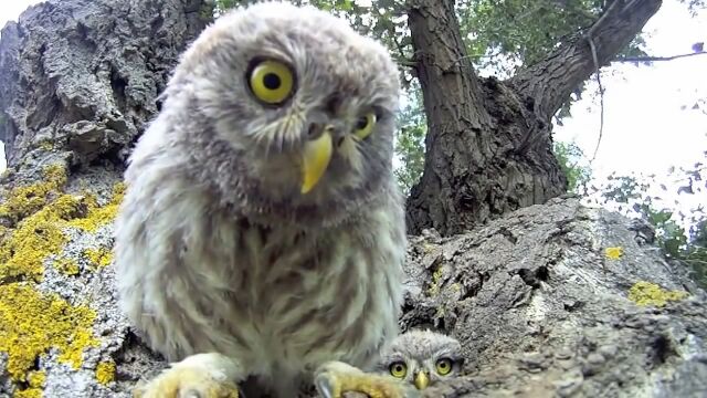 大木のうろに作られた、3羽のフクロウが住む巣穴の真正面にセバスチャン・バリオさんがカメラを設置。出入りするフクロウたちの様子を超至近距離から撮影した映像。