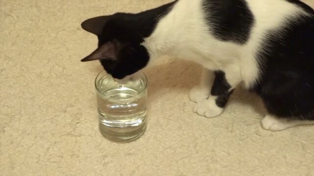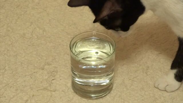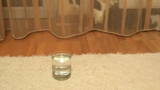 ガラスのコップに炭酸水を入れて部屋の中に放置し、猫のココさんがどんな反応を見せるのかを観察した映像。