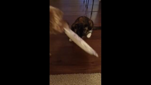 犬「それボクのなのに…」猫にエサを奪われながらも、為す術もなく見守る犬