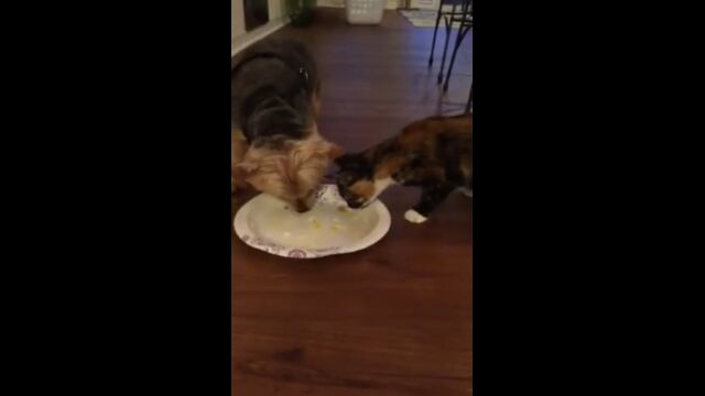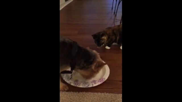 犬がエサを食べている最中に遠慮無く近づいてきて、犬のエサを奪い始めた猫。