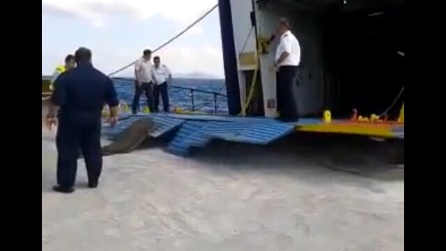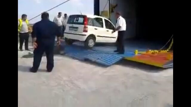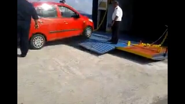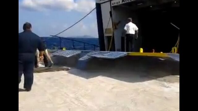 フェリーが揺れるたびに持ち上がる跳ね橋を、スタッフの指示に従い、下がりきったタイミングで大急ぎで乗り込む。