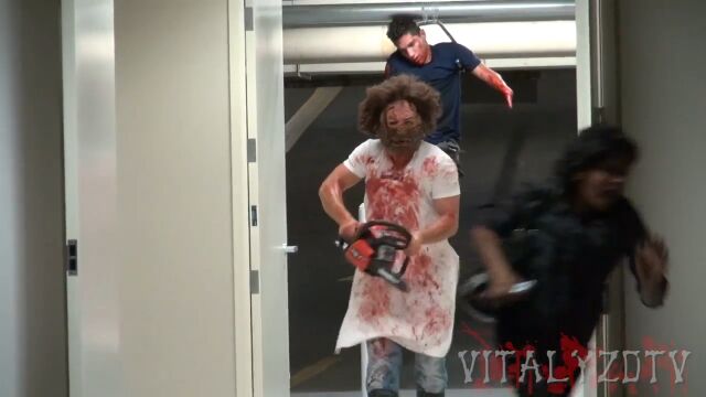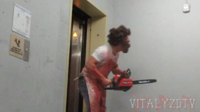 生まれつき両手足を欠損したニックさんが犠牲者に扮した、チェーンソーを持った殺人鬼のドッキリ映像。