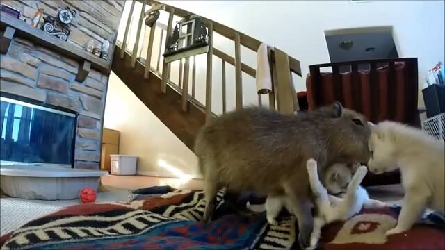 コロコロした子犬たちと戯れるカピバラさん、どっちも可愛い