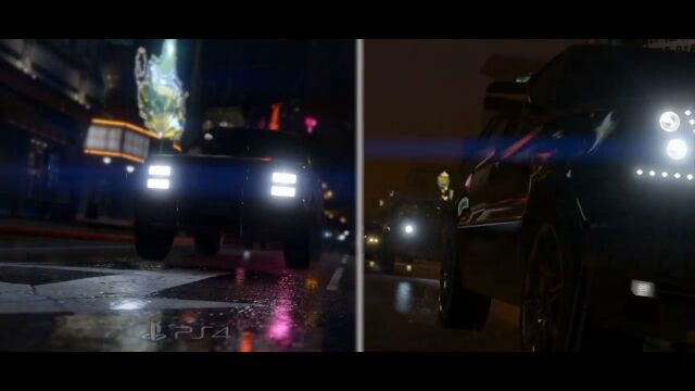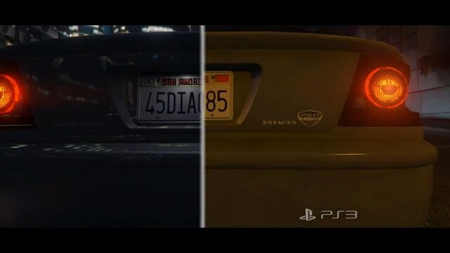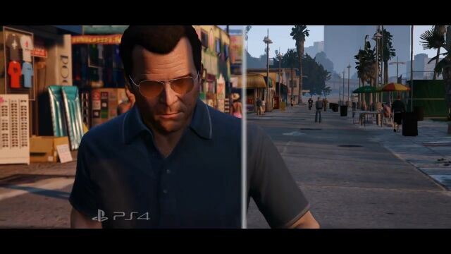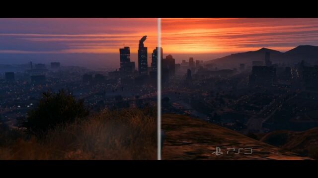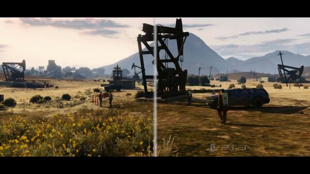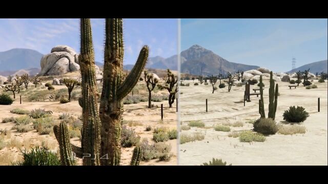 比較しているのはグランド・セフト・オート Vの映像で、草木の量、サボテンや車の質感、雨に濡れた路面の表現などが段違いで凄い。