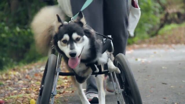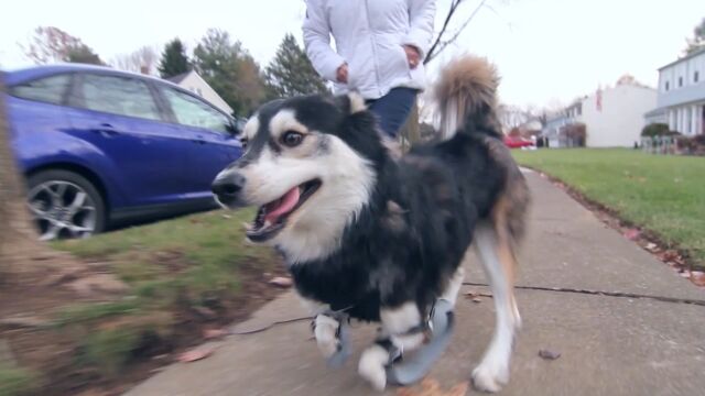 ダービーは生まれながらにして歪んだ両前足を持つ犬。これまでは前足部分に大きなふたつのタイヤを装着させていたけれど、タイヤそのものがダービーの走る動きを阻害してしまう問題点もあった。