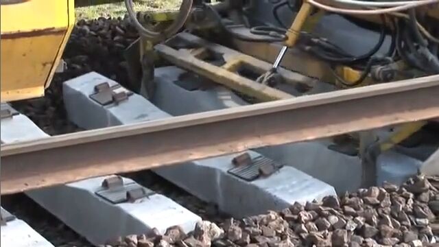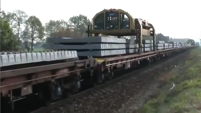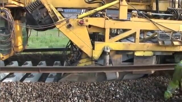 線路の古くなった枕木を新品と交換する特殊車両の作業の様子を撮影した映像。
