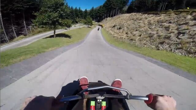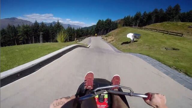 エンジンが付いていない、ただ転がるだけのブレーキ付きカートに乗ってダウンヒルを滑り降りる、ニュージーランド、クイーンズタウンで楽しめるリュージュ・ラン。