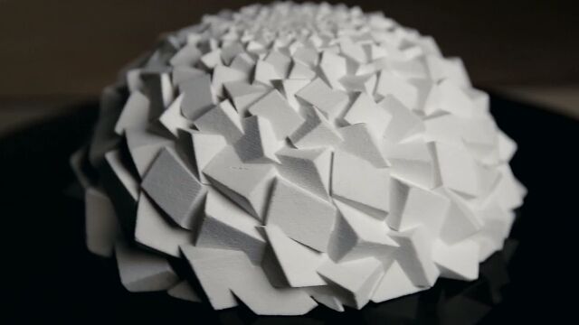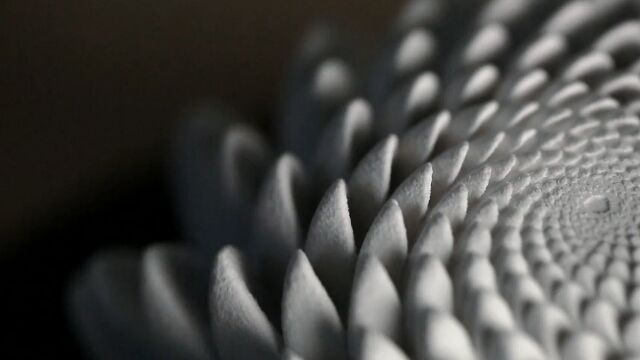ひまわりの種の螺旋や、入れ子ドリル野菜のロマネスコなどに現れるフィボナッチ数にもとづいて、3Dプリンタで作られた各種構造物。