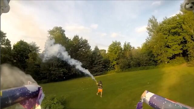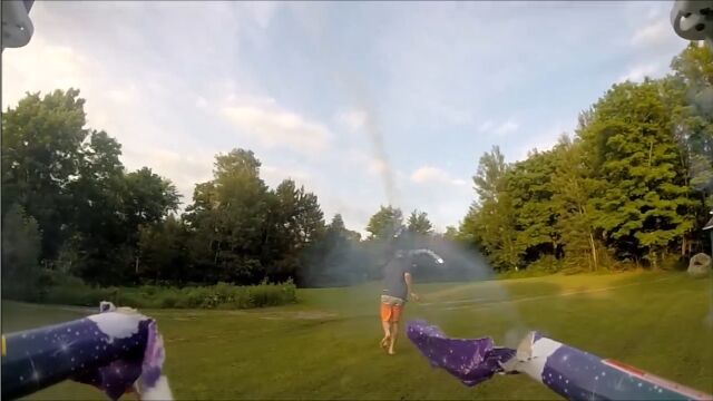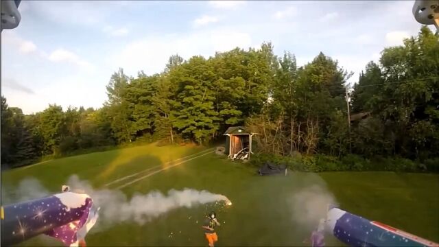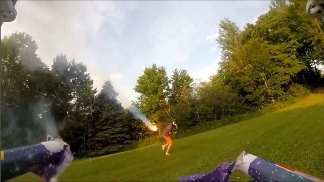 マルチコプターに連発花火を搭載し、フルフェイスヘルメットを被った男を狙撃する遊びがなかなか楽しそう。