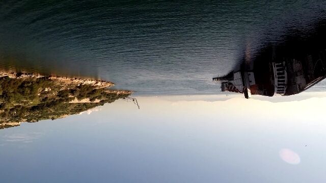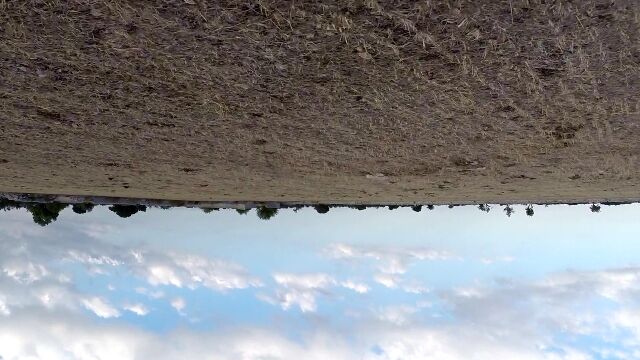 空高くを飛ぶマルチコプターから眺めた、海と大地といくつかの建造物。