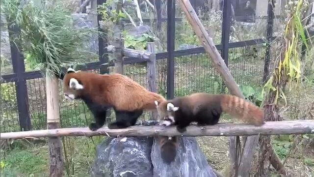 ちょっとヨロヨロしながらも、お母さんレッサーパンダを追って丸太を渡っていく赤ちゃん。