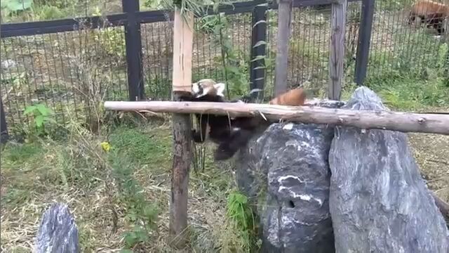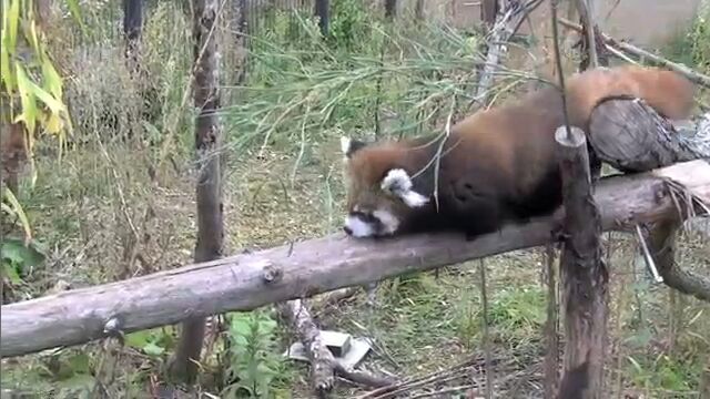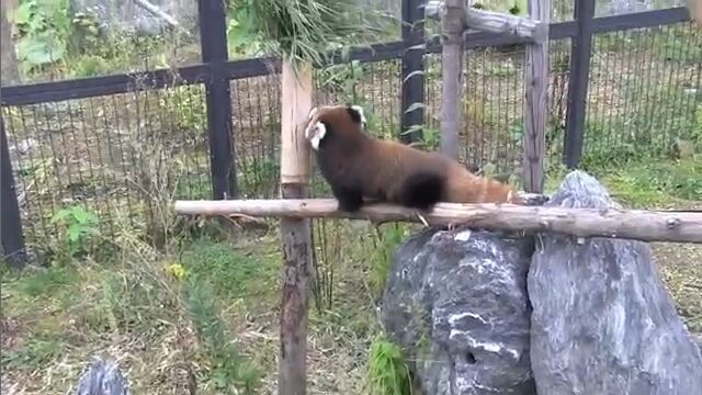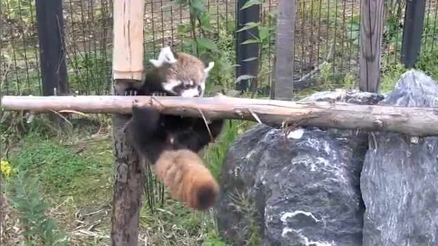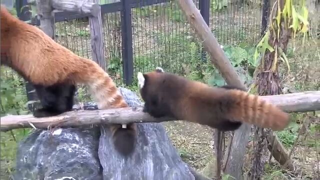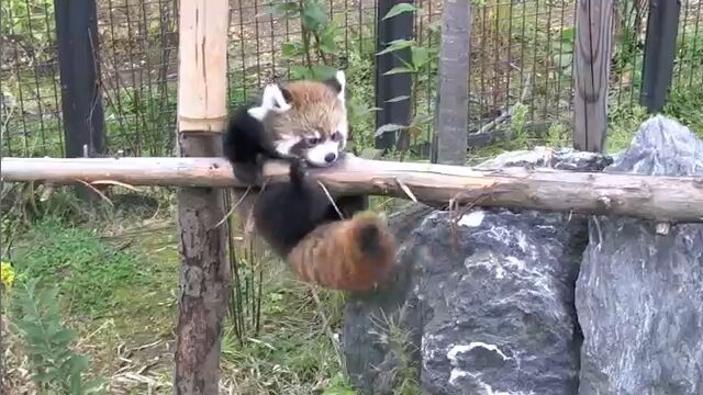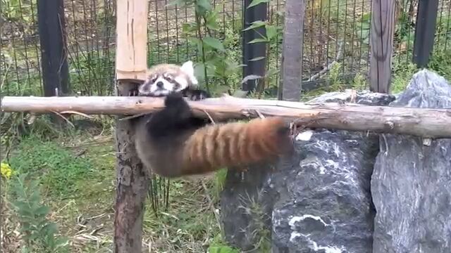 円山動物園で飼育されている生後2ヶ月の赤ちゃんレッサーパンダが、初めて丸太の上を渡る様子を撮影した映像。