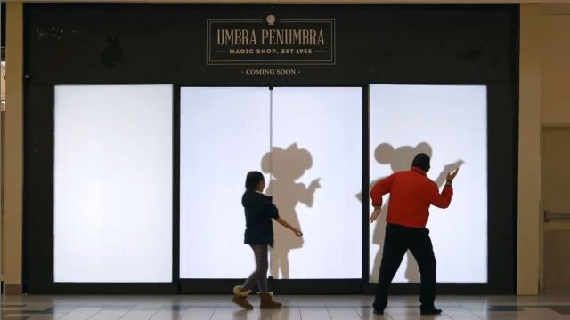 その前を買い物客が通り過ぎると、なぜかミッキーやドナルド、シンデレラやバズ・ライトイヤーなど、ディズニーキャラクターの影が映し出される。