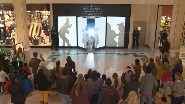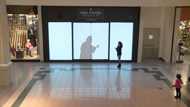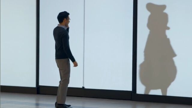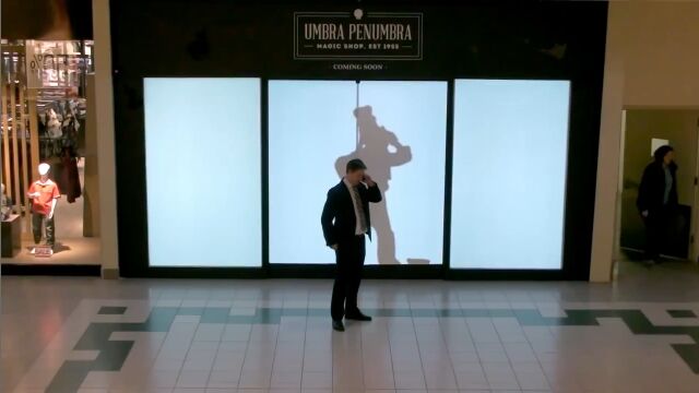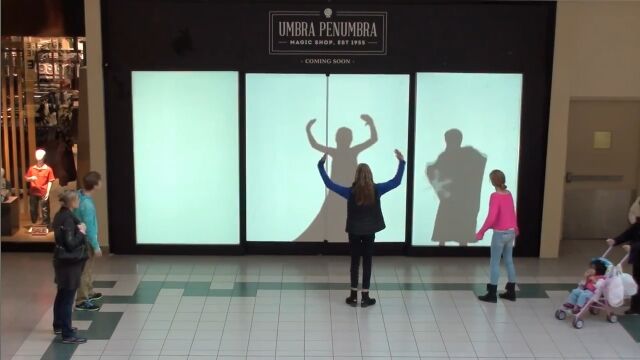 人々の動きを模倣したり、動きにあったリアクションを返す影の様子に、買い物客たちは大喜び。最後にはパネルが開いて……。