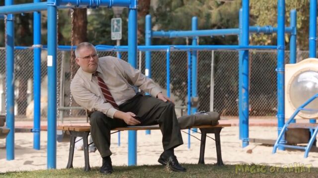 男はドアを盾にこっそり隠れ、リモコン操作でドアを閉めているだけなのに、ベンチに座っている人物からは消え失せたようにしか見えない。