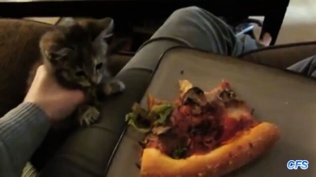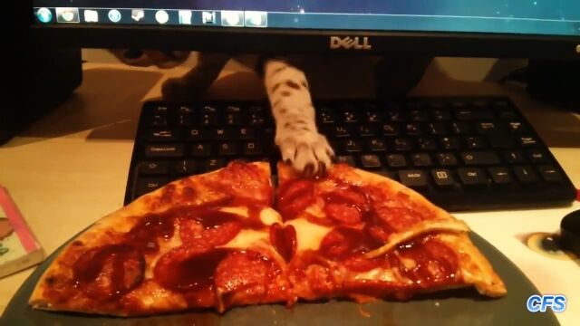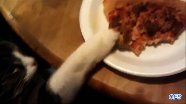 飼い主が食べているピザに手を伸ばし、奪い取っていく腹ペコ猫たちの映像集。
