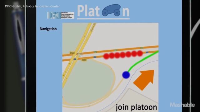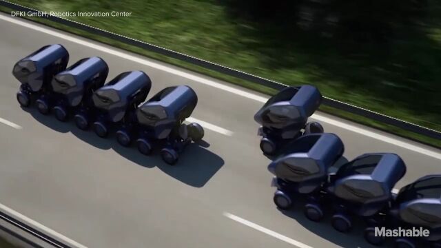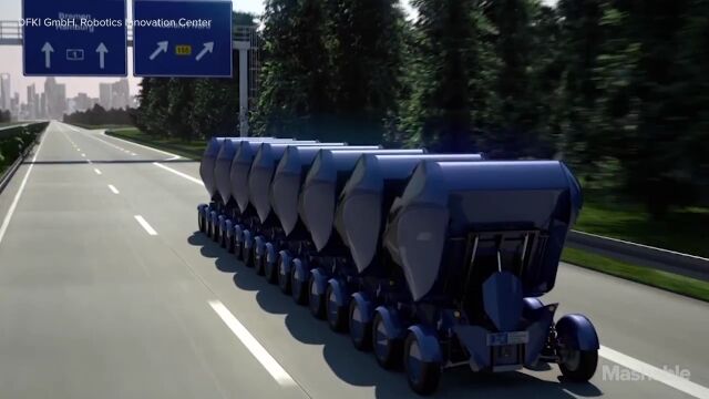 高速道路を走るEO 2同士で合体し、列車のように走行することができ、先頭車両以外のドライバーは運転しないでくつろいでいられる。